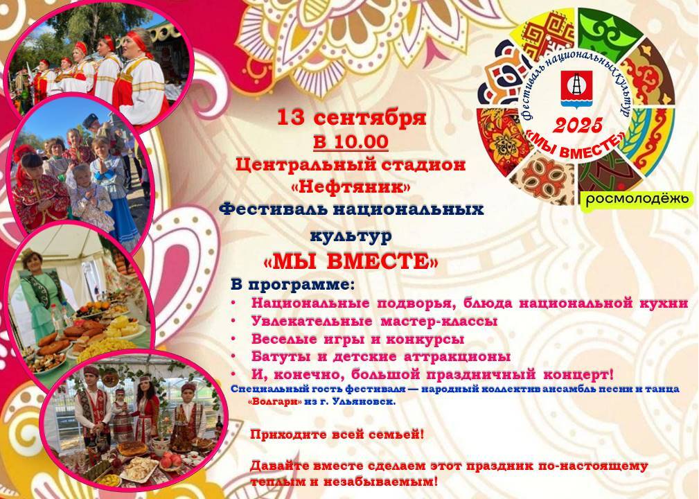 🎉 Уже совсем скоро, 13 сентября, в нашем районе пройдет один из самых ярких и душевных праздников — ежегодный Фестиваль национальных культур «Мы вместе!»